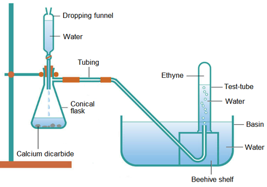 (ii) Ethyne will burn with a luminous, smoky flame and black soot is observed.
