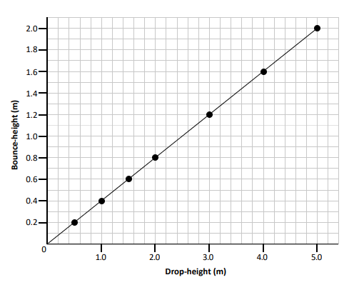 (b) Interpreting the graph: For every increase of 1 m of drop-height on the x-axis, there is a corresponding 0.4 m increase in bounce-height on the y-axis. From the graph, drop-height is directly proportional to the bounce-height. There is a straight line from the origin on the graph; therefore, as the drop-height increases the bounce-height will also increase. From a drop-height of 10 m, the ball should bounce to a height of 4 m.