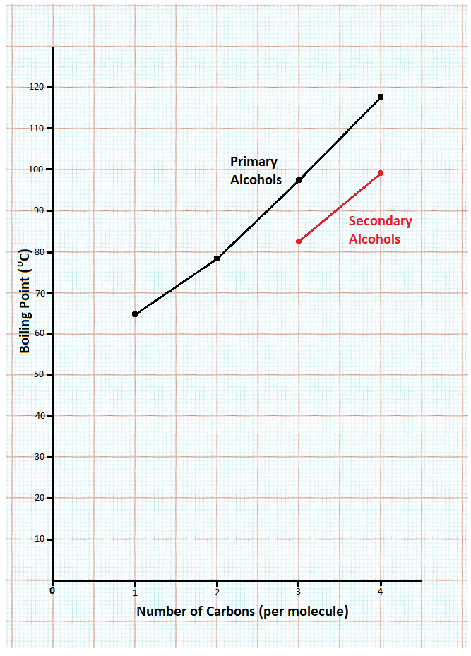 (iii) The boiling points of the four primary alcohols increase as their molecular mass increases as there is hydrogen bonding between the molecules, which is a strong intermolecular bond. Therefore, the larger the molecule, the more energy required to break these bonds; hence, a higher boiling point.