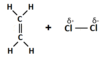 Step 1: Polarisation — as the Cl2 moves towards the double bond of ethene it becomes polarised.