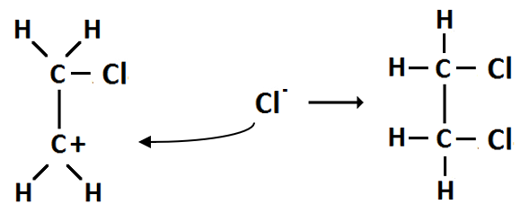 Step 4: Ionic addition — the carbonium ion is then attacked by the Cl- ion forming 1,2 chloroethane.