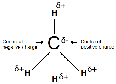 In the CH4 molecule the centre of the positive charge will be at the geometric centre of the molecule so it coincides with the centre of negative charge; therefore, this molecule is non-polar.